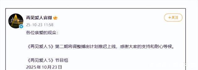 成为节目热点 10月16日,《再见爱人5》带着“婚姻纪实天花板”的噱头首播,原定每周四、周五、周六12点三更正片。 正当#邓莎丧偶式婚姻##路行发言窒息#等话题还挂在热搜榜上时,节目组突然在10月23日中午发布延期公告。