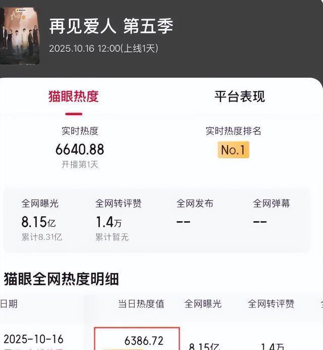 据相关数据显示,《再见爱人5》首播5000万播放量,比上一季多出一倍。 其热度峰值在开播仅两小时就破6300,上线五天播放量突破2亿,成绩极为亮眼。 可谁也没想到,这泼天的热度背后,藏着随时会引爆的“定时炸弹”。